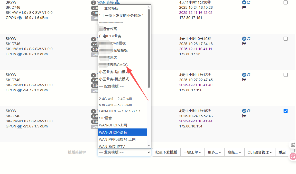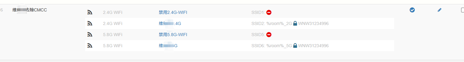 原理:光猫的wifi默认是2.4对应ssid1 5G对应是ssid5 固件写死了ssid1和5必须以CMCC开头 所以下发模板需要禁用1和5 启用2和6 并把2和6的业务添加到路由